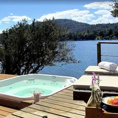 Servicios y amenities destacados: Jacuzzi exterior con vista al lago, Muelle privado, Playa exclusiva, ubicada en una bahía protegida del viento. Ambientes luminosos y conectados con la naturaleza