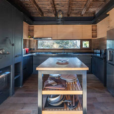Cocina completa totalmente equipada. Comedor con vista al lago y bosque: mesa y sillas para 12 personas.